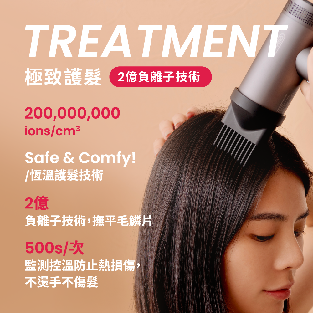 2. 2億負離子技術,撫平毛鱗片;每秒500次監測控溫防止熱損傷,不燙手不傷髮