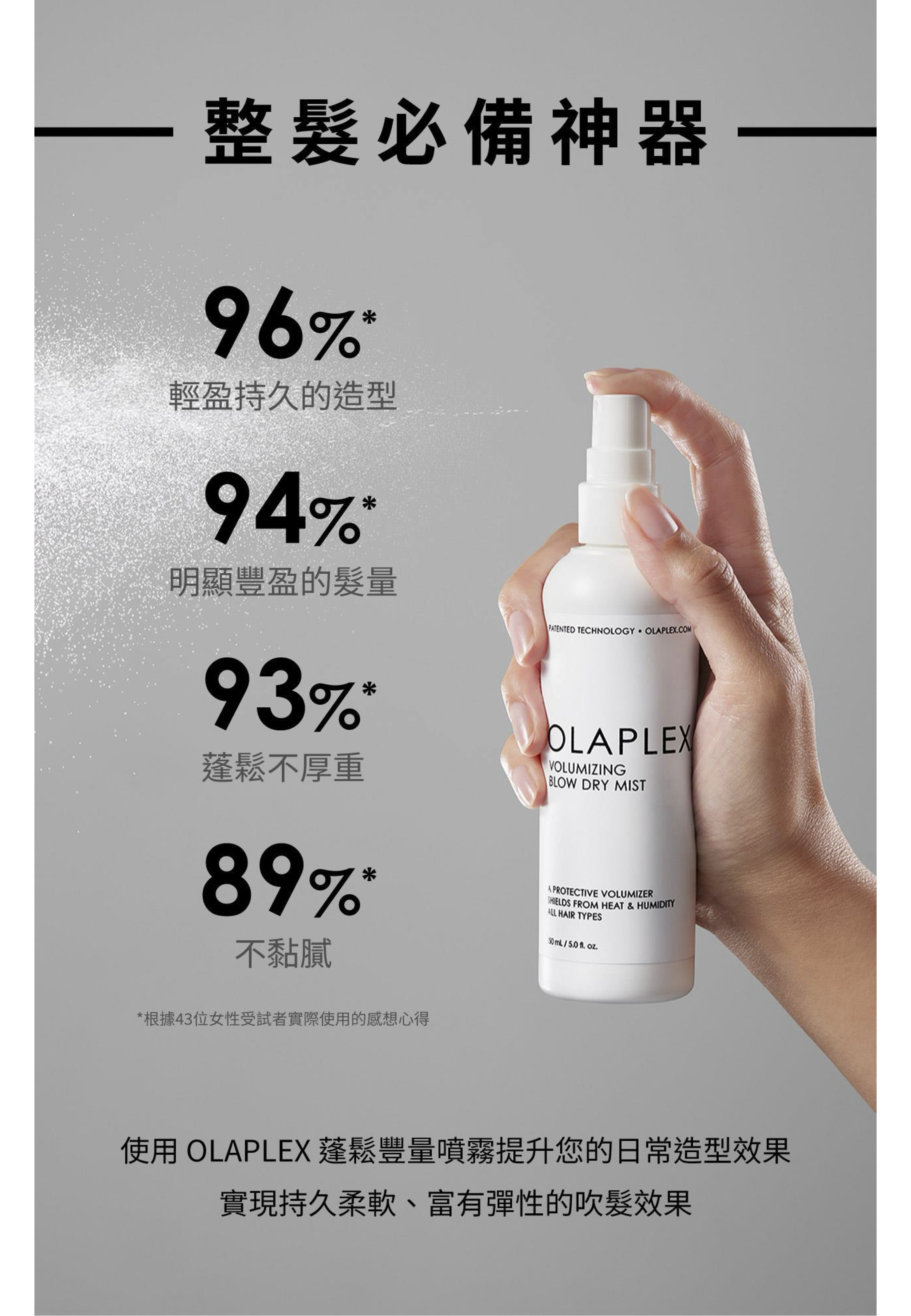 ・可每日使用或造型前使用;噴灑在乾淨的濕髮上並吹整。
