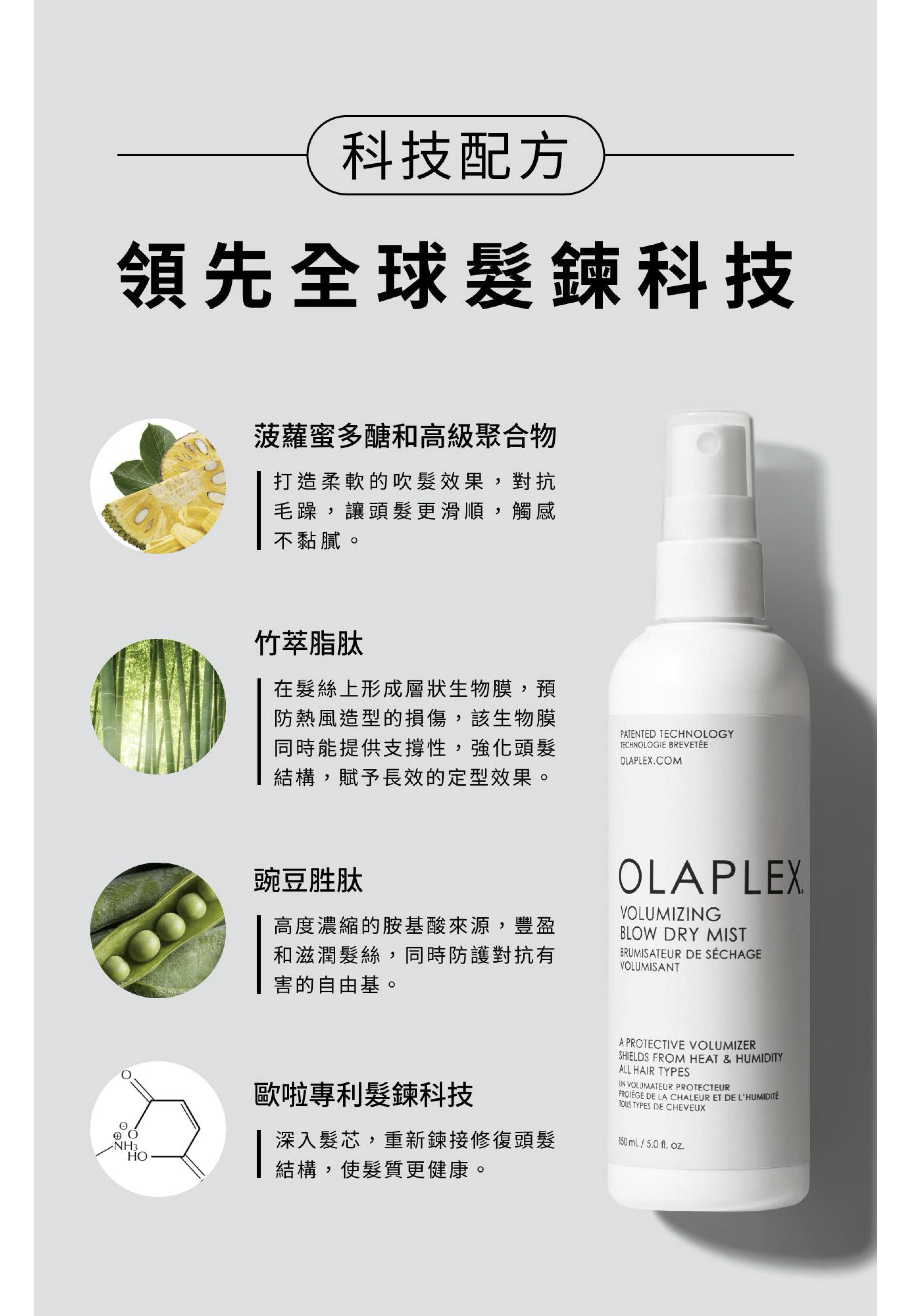 ・結構重建技術和竹子萃取物,修復及保護頭髮。