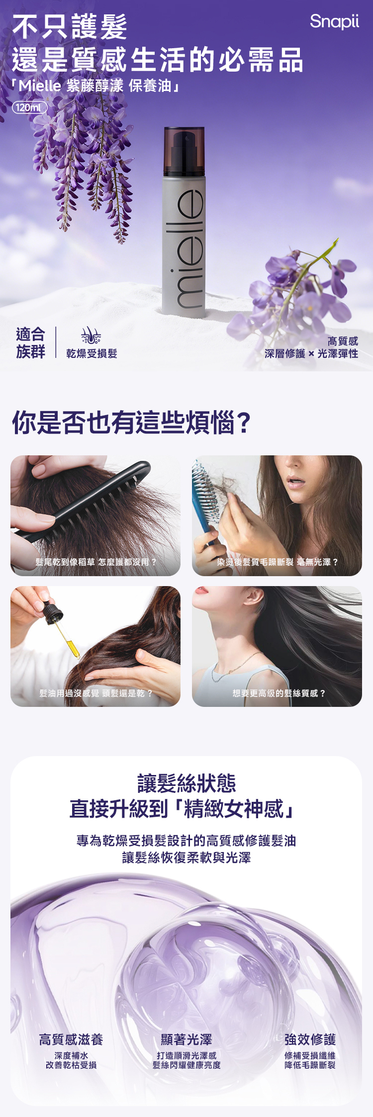 高質感的髮質保養油,提升秀髮顯著的光澤和水分,改善乾燥受損髮的狀況並提升彈性度。